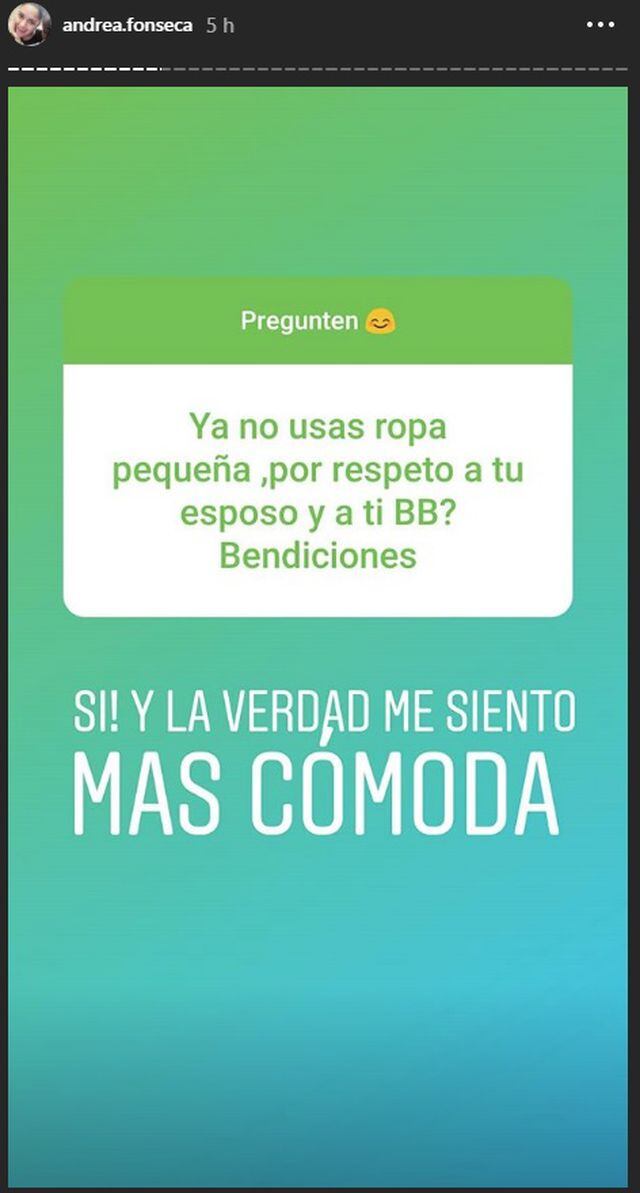 “¿Ya no usas ropa pequeña, por respeto a tu esposo y a tu bebé? Bendiciones”, fue otra de las interrogantes que la bailarina respondió así: “¡Sí! y la verdad me siento más cómoda”.