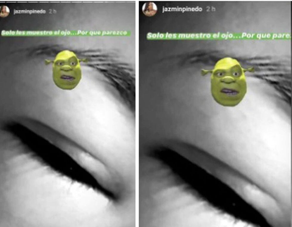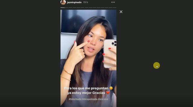 “No parece tanto ¿ya? Pero sí estoy mejor. Estaba horrible, parecía Shrek. Ahora se me quedó esta partecita que está inflamada. Parece que me hubiera comido todo en la cuarentena, pero no es eso, me intoxiqué”, dijo Jazmín en un video.