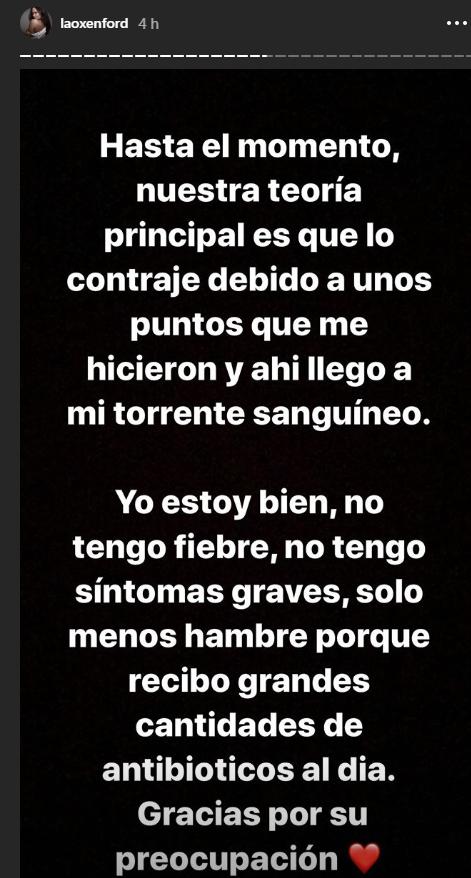 “Hasta el momento, nuestra teoría principal es que lo contraje debido a unos puntos que me hicieron y ahí llegó a mi torrente sanguíneo. Yo estoy bien, no tengo fiebre, no tengo síntomas graves, solo menos hambre porque recibo grandes cantidades de antibióticos al día. Gracias por su preocupación”, concluyó.