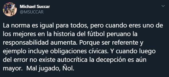 “La norma es igual para todos, pero cuando eres uno de los mejores en la historia del fútbol peruano la responsabilidad aumenta. Porque ser referente y ejemplo incluye obligaciones cívicas. Y cuando luego del error no existe autocrítica la decepción es aún mayor. Mal jugado, Ñol”, escribió el periodista de Movistar Deportes.
