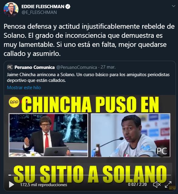“Penosa defensa y actitud injustificablemente rebelde de Solano. El grado de inconsciencia que demuestra es muy lamentable. Si uno está en falta, mejor quedarse callado y asumirlo”, manifestó.