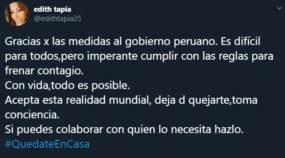 “Gracias por las medidas al gobierno peruano. Es difícil para todos, pero imperante cumplir con las reglas para frenar con el contagio. Con vida, todo es posible. Acepta esta realidad mundial, deja de quejarte, toma consciencia”, escribió Tapia.