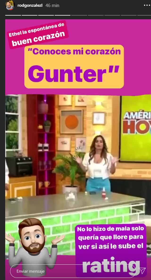 “Ethel, espontánea de buen corazón. ‘Conoces mi corazón, Gunter’. No lo hizo de mala, solo quería que llore para ver si así le sube el rating. Ya no sé quién es más fingida, si la hija o la madre”, comentó en su cuenta de Instagram.