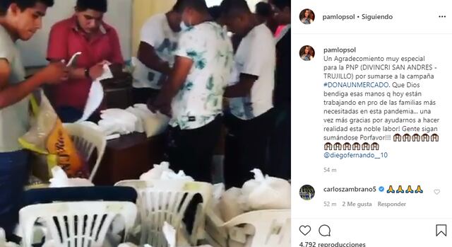 “Un Agradecomiento muy especial para la PNP (DIVINCRI SAN ANDRES -TRUJILLO) por sumarse a la campaña #DONAUNMERCADO. Que Dios bendiga esas manos q hoy están trabajando en pro de las familias más necesitadas en esta pandemia... una vez más gracias por ayudarnos a hacer realidad esta noble labor! Gente sigan sumándose Porfavor!!!”, escribió la esposa de Christia Cueva.