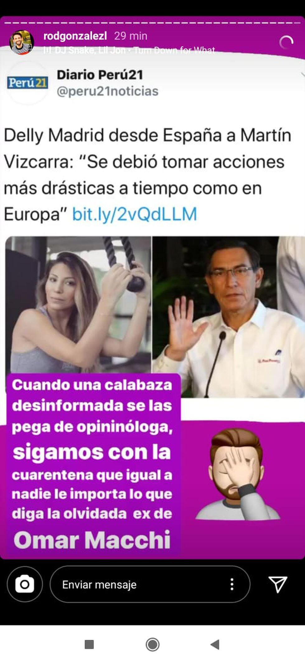 El exconductor de espectáculos, Rodrigo González “Peluchín”, salió al frente para arremeter contra la modelo Delly Madrid, quien criticó al presidente Martín Vizcarra porque según ella, el mandatario muy tarde tomó acciones contra el coronavirus o covid-19.