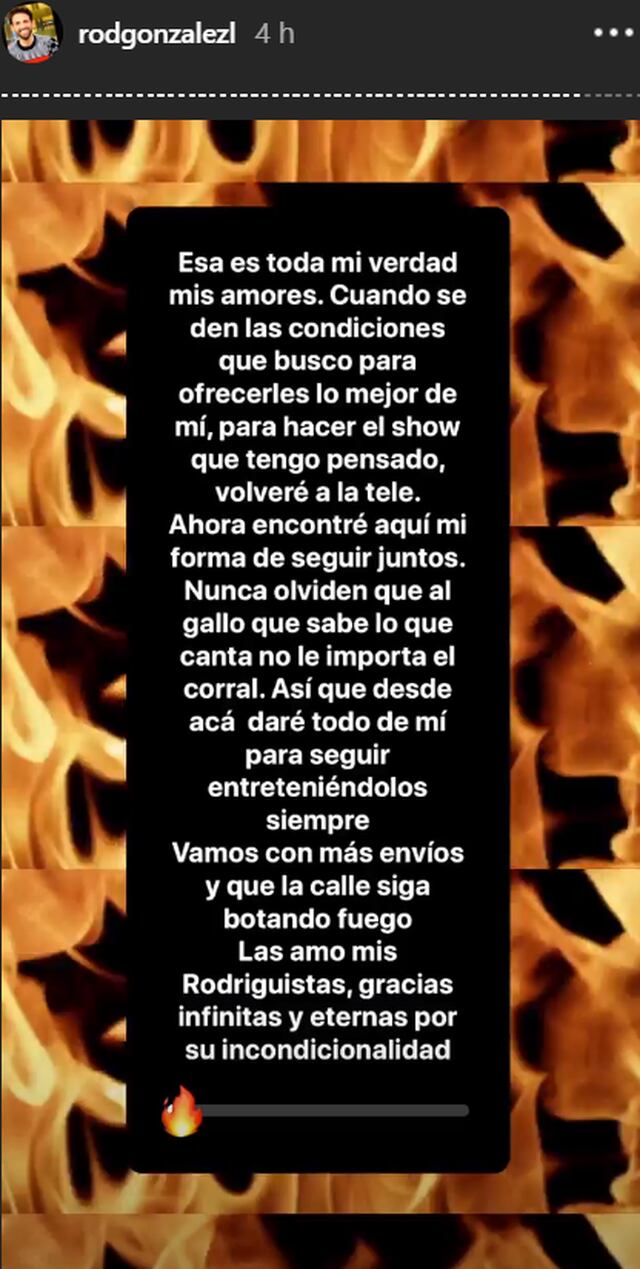 “Esa es toda mi verdad mis amores. Cuando se den las condiciones que busco para ofreceles lo mejor de mí, para hacer el show que tengo pensado, volveré a la tele”, escribió Rodrigo González “Peluchín”.