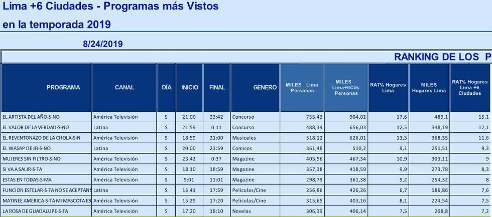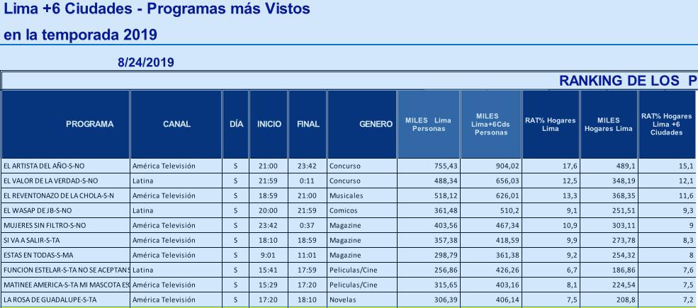 “El artista del año” hizo 17.6 puntos de rating, logrando quedarse, una vez más, con el primer lugar en sintonía. Luego le siguen “El reventonazo de la chola” con 13.3., “El Wasap de JB” con 9.3, “Mujeres sin filtro” con 9 puntos.