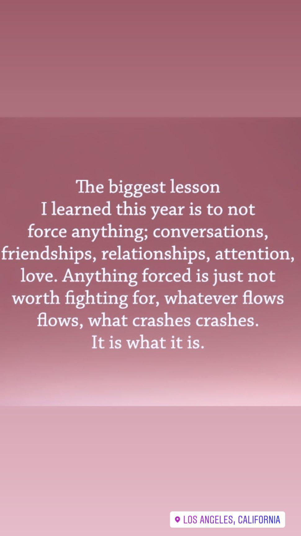 “The biggest lesson I learned this year is to not force anything; conversations, friendships, relationships, attention, love. Anything forced is just not worth fighting for, whatever flows flows, what crashes crashes. It is what it is”, se lee en la publicación.