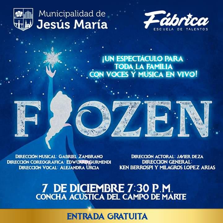 La municipalidad de Jesús María anunció que hoy sábado 7 de diciembre presentará la obra teatral “Frozen: Una aventura musical”, basada en la exitosa película de Disney “Frozen”, cuya segunda entrega se encuentra en cartelera.
