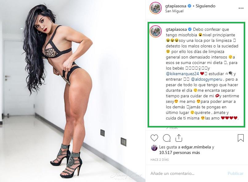 “Debo confesar que tengo misofobia nivel principiante soy una loca por la limpieza, detesto los malos olores o la suciedad, por ello los días de limpieza general son demasiado intensos. A esos se suma cocinar mi dieta, para los bebés y @kikemarquez24, estudiar y entrenar @aldosgymperu, pero a pesar de todo lo que tengo que hacer durante el día, me encanta separar tiempo para cuidar de mi y sentirme sexy, me amo para poder amar a los demás. Jamás te pongas en último lugar, quiérete, ámate y cuida de ti misma, las amo”, escribió.