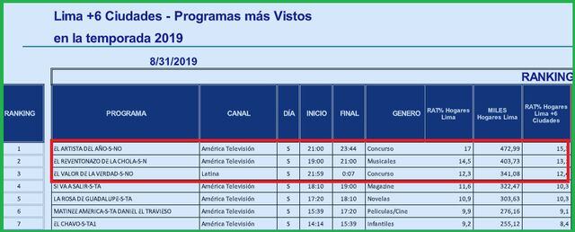 ¿Cuánto rating hizo ‘El valor de la verdad’ de Dayanita? El programa del periodista hizo 12.3 puntos promedio en sintonía, muy por debajo de Gisela Valcárcel. Mientras que ‘El reventonazo de la Chola’ obtuvo 14.5 puntos.