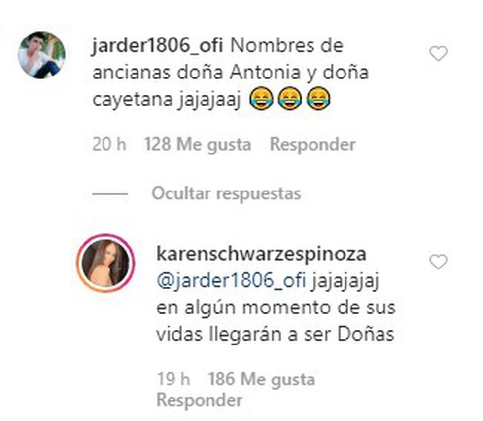 Tras el anuncio, Karen Schwarz recibió varias felicitaciones de sus seguidores. Sin embargo, un usuario no estuvo de acuerdo con la elección del nombre y la criticó duramente: “Nombres de ancianas doña Antonia y doña Cayetana jajajajaj”, escribió.