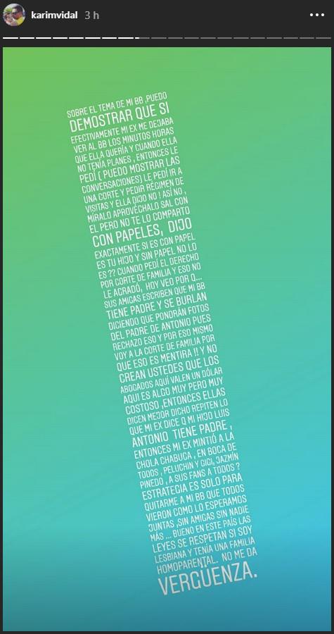 “(Es una) estrategia, es solo para quitarme a mi bebé que todos vieron cómo lo esperamos juntas, sin amigas ni nadie más... bueno en este país las leyes se respetan. Sí, soy lesbiana y tenía una familia homoparental, no me da vergüenza”, indicó Karim Vidal.