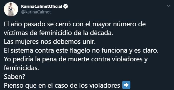 “El año pasado se cerró con el mayor número de víctimas de feminicidio de la década. Las mujeres nos debemos unir. Yo pediría la pena de muerte contra violadores y feminicidas”, inició escribiendo en sus redes.