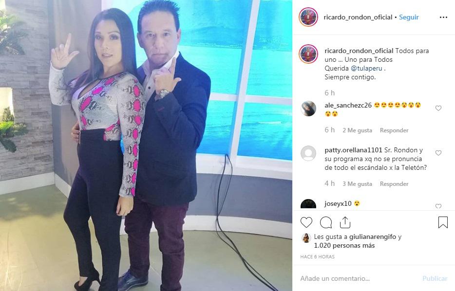 No solo eso, Ricardo Rondón también compartió una foto junto a Tula Rodríguez en la cual colocó como leyenda: “Todos para uno ... Uno para todos querida @tulaperu. Siempre contigo”.