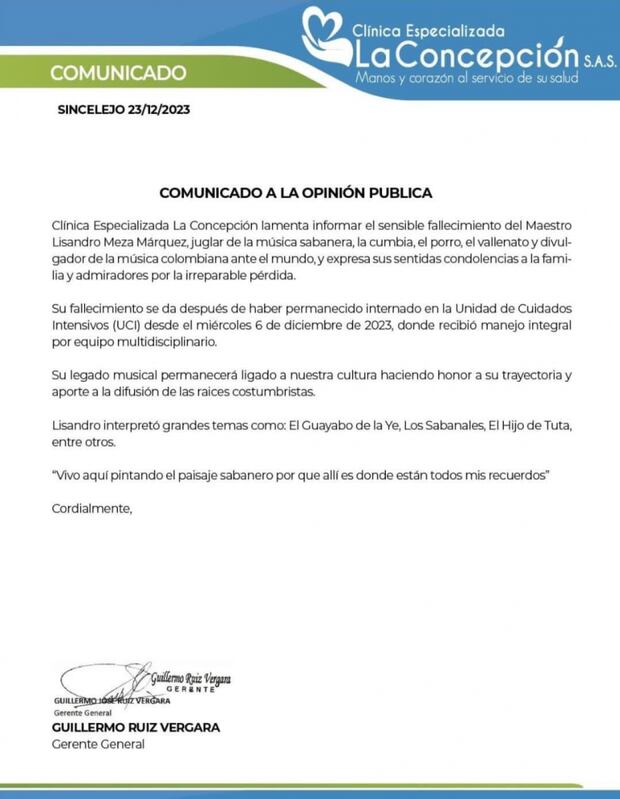 La tarde de hoy sábado 23 de diciembre, la Clínica Concepción emitió un comunicado informando el fallecimiento del reconocido músico. Aunque el comunicado no detalla las causas del deceso, señala que Lisandro Meza estuvo internado en la Unidad de Cuidados Intensivos desde el 6 de diciembre, recibiendo atención integral por parte de un equipo multidisciplinario.