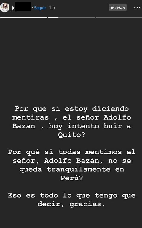 “Por qué si estoy diciendo mentiras, el señor Adolfo Bazán, hoy intentó huir a Quito? ¿Por qué si todas mentimos el señor, Adolfo Bazán, no se queda tranquilamente en Perú? Eso es todo lo que tengo que decir, gracias”, escribió la joven.