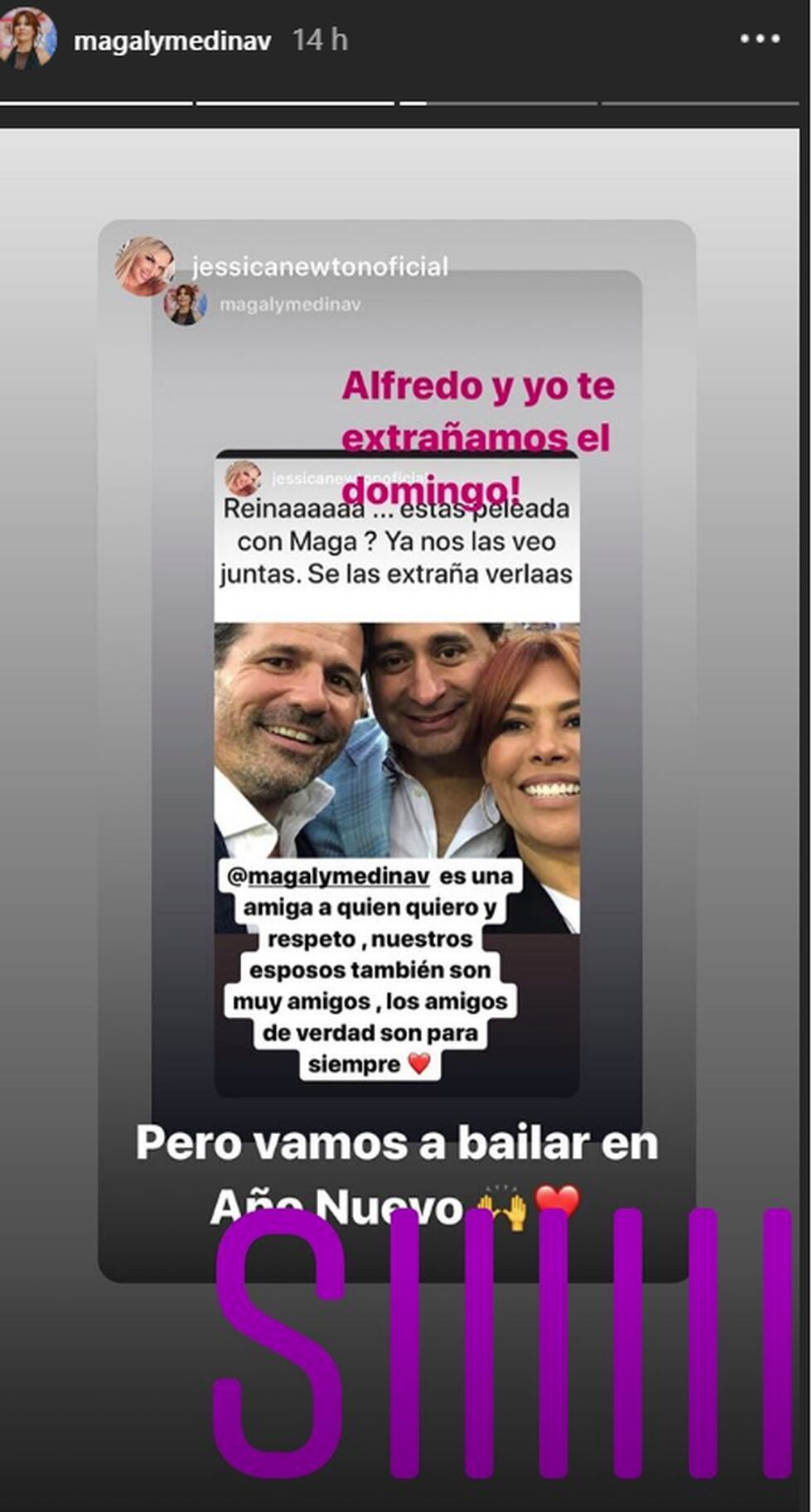 “Magaly es una amiga que quiero y respeto, nuestros esposos también son muy amigos, los amigos de verdad son para siempre”, escribió Jessica Newton, a lo que Magaly Medina respondió: “Alferto y yo te extrañamos el domingo!”.