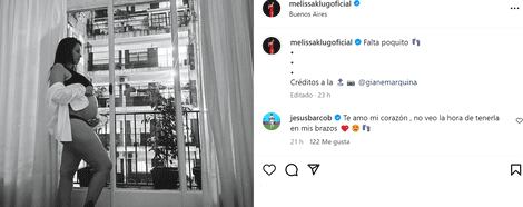“Falta poquito”, fue lo que escribió la influencer en su fotografía en blanco y negro. Además, Jesús Barco comentó: “Te amo mi corazón , no veo la hora de tenerla en mis brazos”.