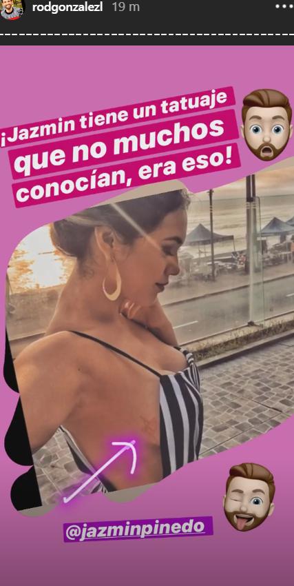 Se trata de un tatuaje al costado del busto de color marrón y al parecer es una flor o un mariposa. “¡Jazmín tiene un tatuaje que no muchos conocían, era eso!”, escribió Rodrigo González “Peluchín".