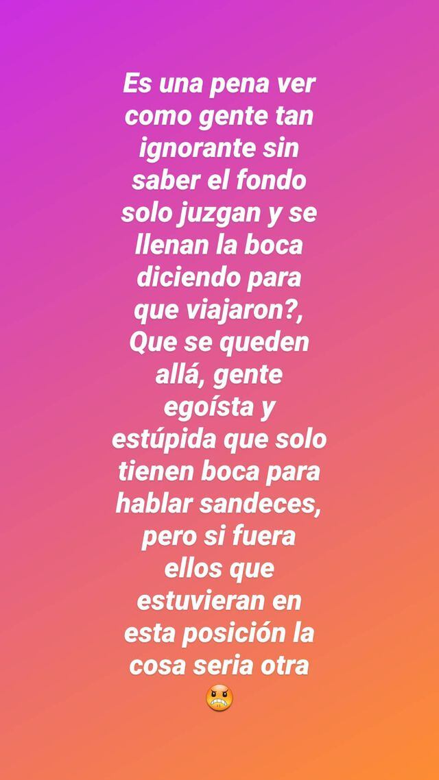 La jovencita también defendió a su pareja de las críticas y dijo que todos eran unos egoístas: “Es una pena ver cómo gente tan ignorante, sin saber el fondo, solo juzgan y se llenan la boca diciendo ‘¿para qué viajaron?’, ‘que se queden allá’. Gente egoísta y estúpida que solo tienen boca para hablar sandeces, pero si fueran ellos que estuvieran en esta posición la casa sería otra”.