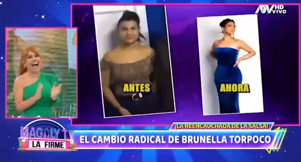 Magaly Medina no pudo ocultar su sorpresa por el increíble cambio de imagen de la artista peruana. La popular conductora de espectáculos elogió a la cantante por no ocultar sus ‘arreglos’, pues Brunella Torpoco confesó que se sometió a una liposucción, aumento de trasero y un aumento de pecho así como algunos “retoquitos” en el rostro.