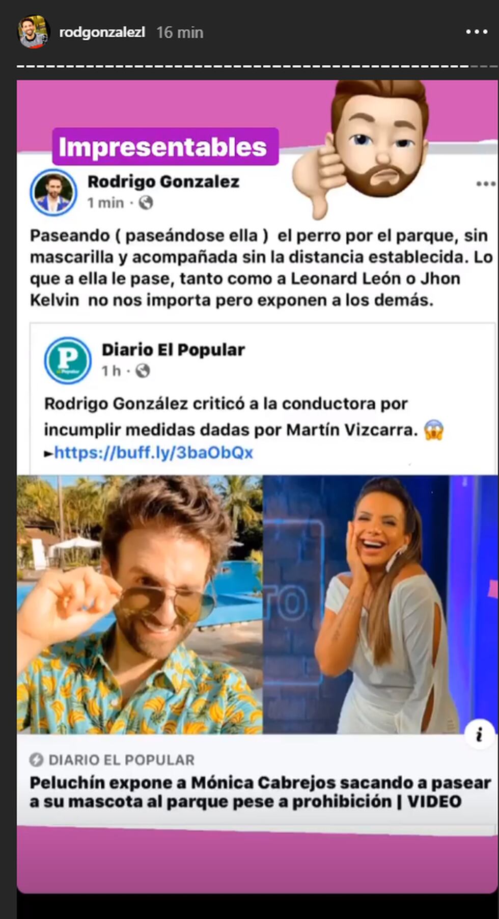 “Paseando (paseándose ella) el perro por el parque, sin mascarilla y acompañada sin la distancia establecida. Lo que a ella le pase, tanto como a Leonard León o Jhon Kelvin no nos importa, pero exponen a los demás”, manifestó Rodrigo.