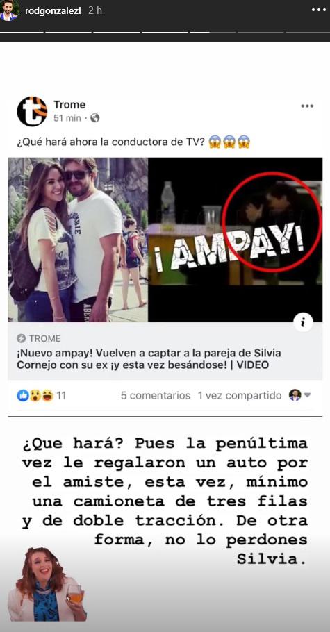Rodrigo González, como todo conductor de espectáculos, decidió opinar sobre el nuevo “ampay” que protagonizó la pareja de Silvia Cornejo, Jean Paul Gabeteau. Esta vez no lo hizo en televisión, sino a través de su cuenta de Instagram, donde aseguró que aunque esté alejado de las pantallas continuará al día con los temas de la farándula.