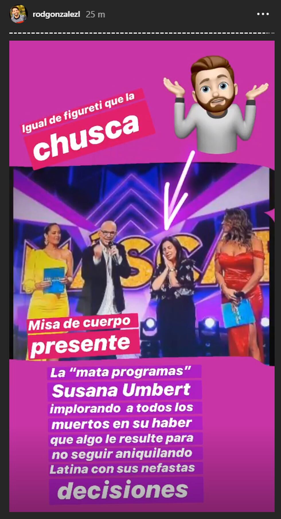 “Igual de figureti que la chusca (Cathy Sáenz). La ‘mata programas’, Susana Umbert, implorando a todos los muertos en su haber, que algo le resulte para no seguir aniquilando Latina con sus nefastas decisiones", escribió en su cuenta oficial de Instagram.