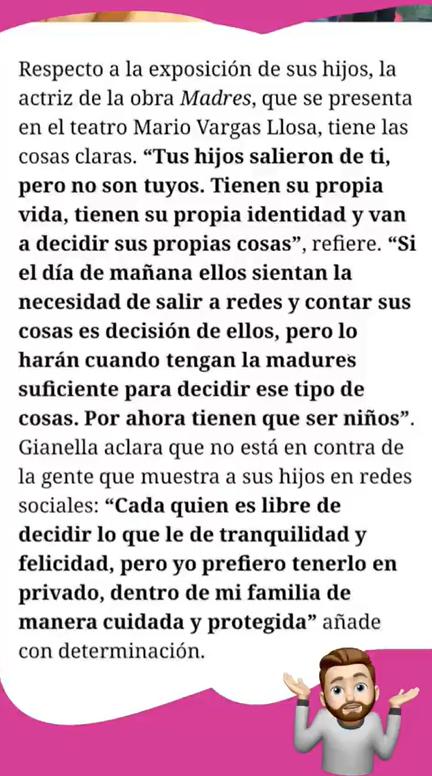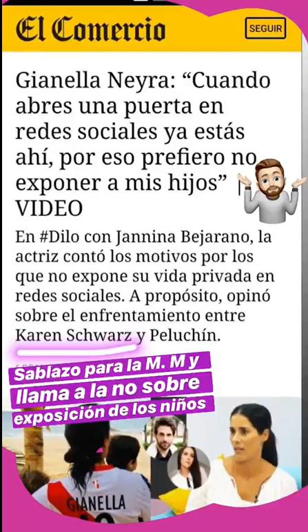 Y es que el presentador compartió una entrevista que El Comercio le hizo a la actriz Gianella Neyra, quien explicó por qué nunca expone, ni muestra el rostros de sus dos pequeños hijos en sus redes sociales.