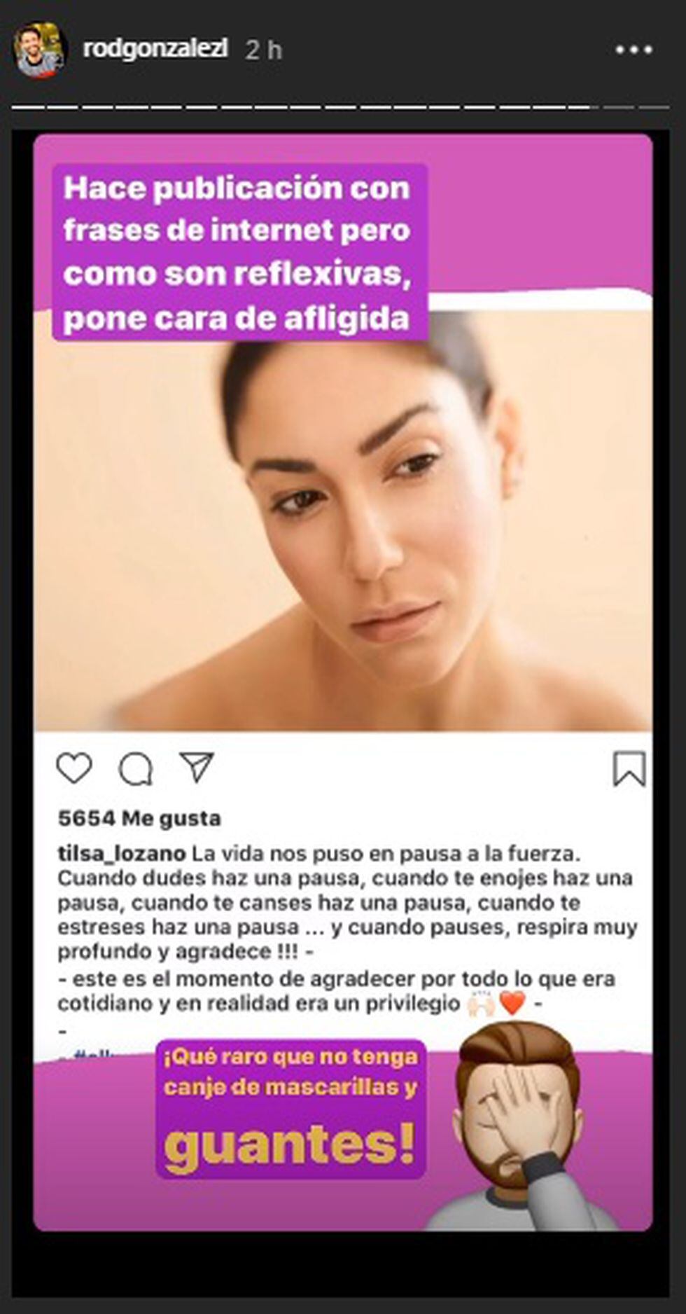 "Hace publicación con frases de internet pero como son reflexivas, pone cara de afligida. ¡Qué raro que no tenga canje de mascarillas y guantes!", escribió Rodrigo González.