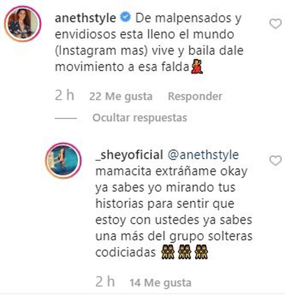 “De malpensados y envidiosos está lleno el mundo (Instagram más) vive y baila, dale movimiento a esa falda”, le escribió Aneth a Sheyla Rojas.