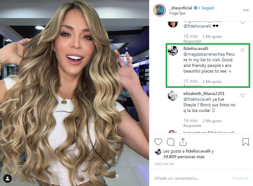 Lo que más llamó la atención fue el mensaje que Fidelio Cavalli le dejó a Sheyla Rojas en su última foto. El libanés le colocó un emoji enviándoles besos y la rubia respondió escribiendo “Tqm” (Te quiero mucho).