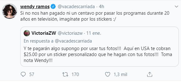 “Si no nos han pagado ni un centavo por pasar los programas durante 20 años en televisión, imagínate por los stickers”, escribió Wendy Ramos en su cuenta de Twitter.
