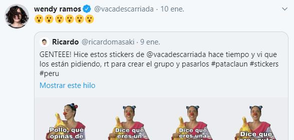 “Gente. Hice estos stickers de @vacadescarriada (Wendy) hace tiempo y vi que los están pidiendo, retweet para crear el grupo y pasarlos #pataclaun #stickers #peru”, escribió el joven.