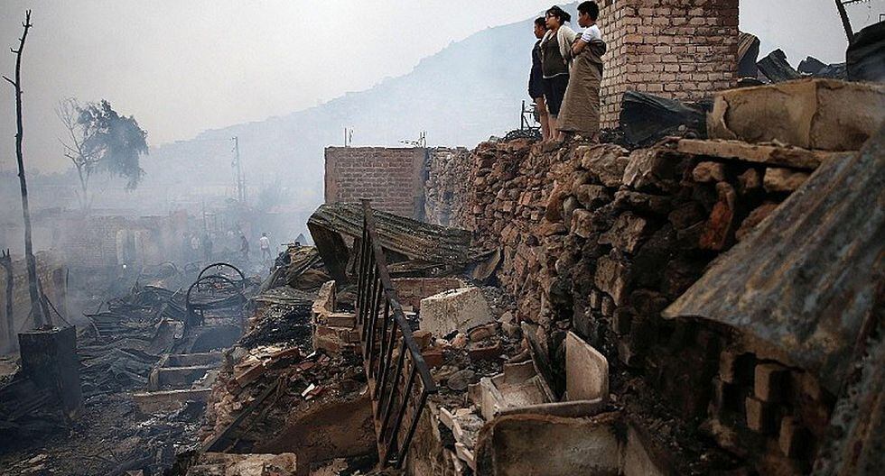 “El fuego consumió todo en cuestión de minutos. Estaba durmiendo cuando escuché los gritos y de pronto explosiones de balones de gas. Agarré a mis hijos y salí corriendo para ponerlos a salvo, no me dio tiempo para rescatar mis cosas”, cuenta Jessica Hualla, mientras mira con lágrimas las cenizas de lo que antes era su casa.