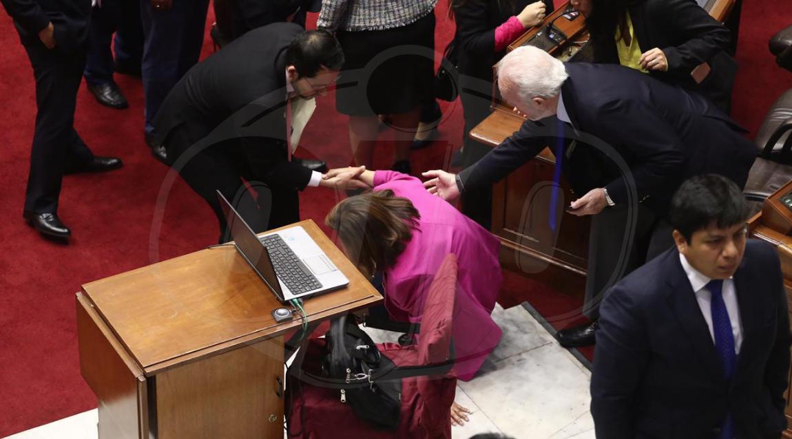 La parlamentaria tuvo que ser ayudada por algunos colegas suyos para poder ponerse de pie. Mientras esto sucedía, los congresistas continuaban con la trifulca. Posteriormente, el premier Salvador del Solar se retiró del hemiciclo.