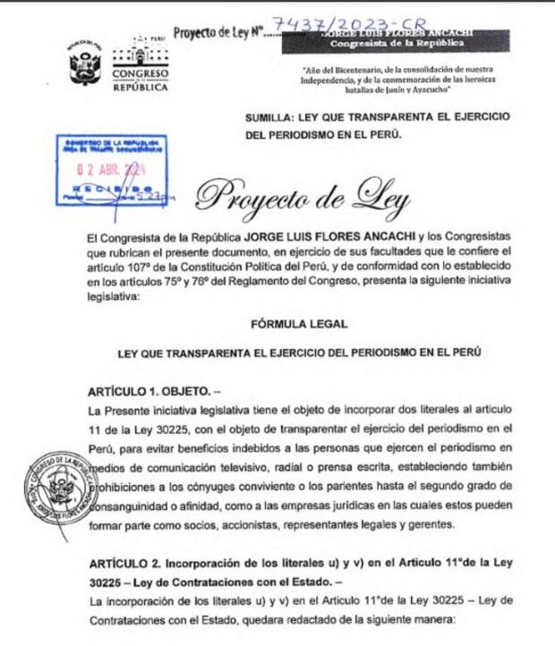 El congresista Jorge Flores Ancachi, como autor principal, junto a sus colegas Darwin Espinoza, Luis Aragón, Elvis Vergara y Wilson Soto - todos investigados por el Caso ‘Los Niños’ - presentaron un proyecto que prohíbe que conductores, productores y directores de medios de comunicación y sus familiares contraten con el Estado.
