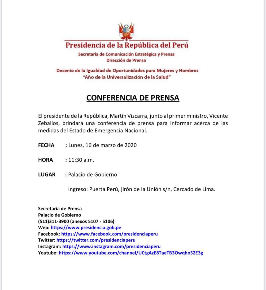 El presidente de la República, Martín Vizcarra, anunciará en conferencia de prensa nueva medidas sobre el Estado de Emergencia por 15 días en el Perú.