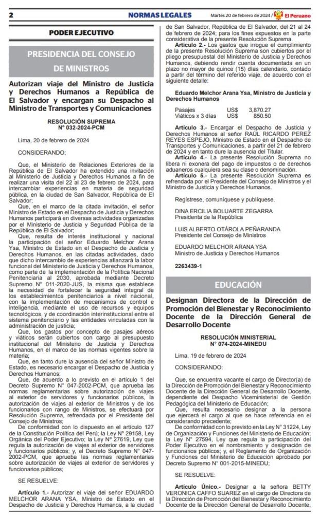 Según lo detallado en la Resolución Suprema N° 032-2024-PCM publicada en el Boletín Extraordinario de Normas Legales de este martes 20 de febrero, el viaje será entre los días 21 y 24 de febrero y tiene por objetivo la participación de Arana en las actividades organizadas por el Ministerio de Justicia y Seguridad Pública de El Salvador.