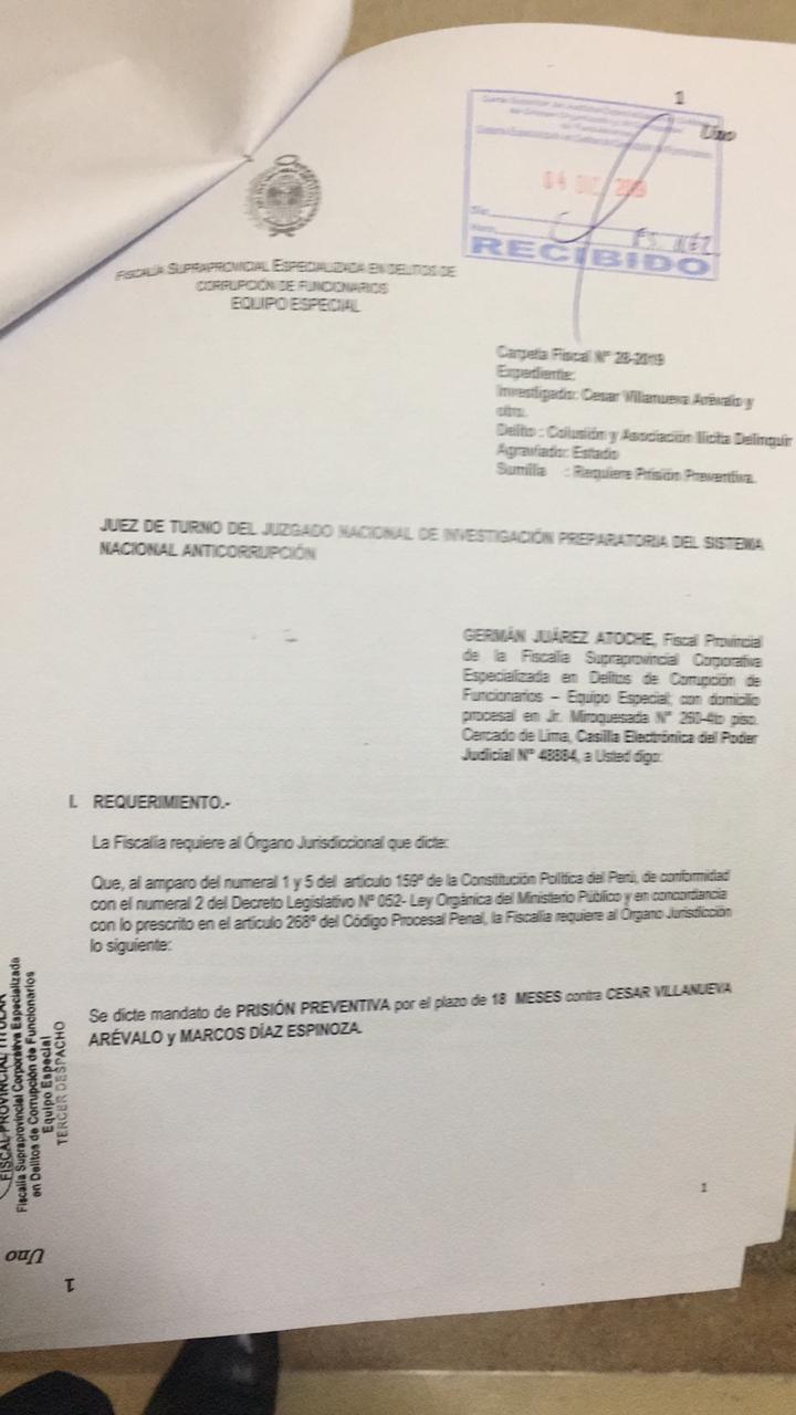 El fiscal del Equipo Especial Germán Juárez solicitó esta medida al juez de investigación preparatoria Jorge Chávez Tamariz ante las acusaciones de que el expremier recibió 320 mil dólares de la empresa Odebrecht para adjudicarle la construcción de la carretera San José de Sisa cuando Villanueva era presidente regional de San Martín.