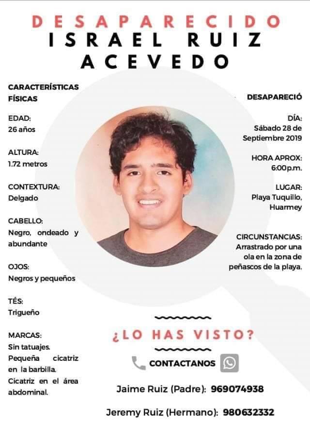 “Se necesita apoyo para que busquen en el mar, los guardacostas y bomberos solo están en las periferias sin poder adentrarse, meterse al mar por el fuerte oleaje”, dijo su papá Jaime Ruiz.