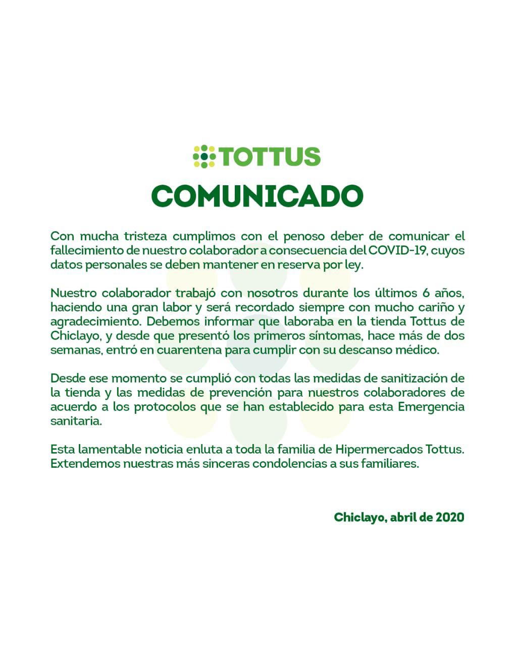 “Nuestro colaborados trabajó con nosotros durante los últimos seis años, haciendo una gran labor y será recordado siempre con mucho cariño y agradecimiento. Debemos informar que laboraba en la tienda Tottus de Chiclayo, y desde que presentó los primeros síntomas, hace más de dos semanas, entró en cuarentena para cumplir con su descanso médico”, señala el comunicado.