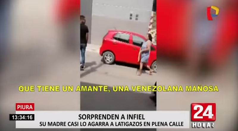 Fueron los vecinos quienes registraron este hecho y alentaban a la madre a que castigue a su hijo infiel.