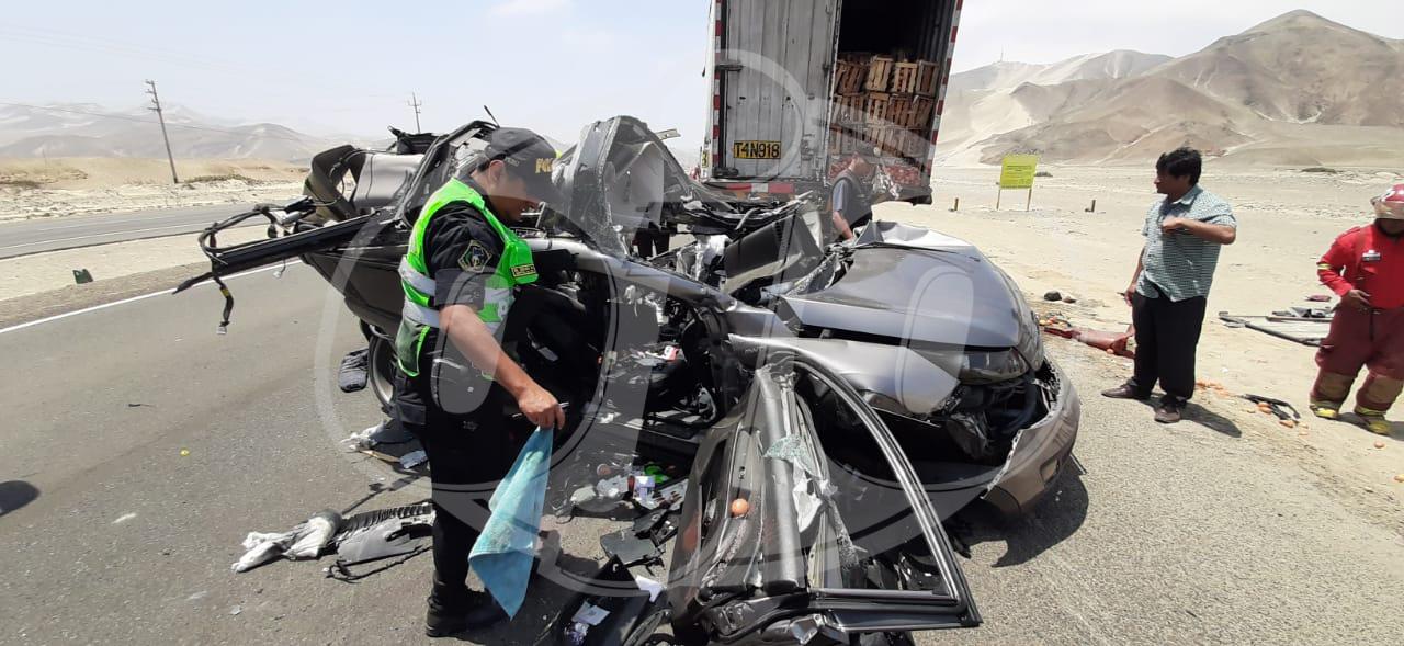 En el km 272 de la Panamericana Norte, una camioneta de placa T2B-134 impactó contra el tráiler de placa T4N-918 que transportaba un cargamento de tomates.