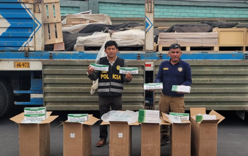 Entre el cargamento que transportaba, la policía encontró seis cajas de cartón, en cuyo interior se encontró 60 mil cigarrillos de la marca Golden Beach, por un valor cercano a los 100 mil soles.