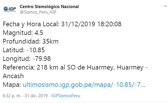 Esta tarde y a poco de la llegada del 2020, la tierra tembló en la ciudad de Huarmey.